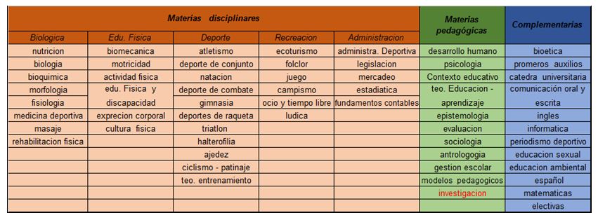 El plan de estudios o malla curricular plasma la estructura académica semestral, a continuación observaremos las generalidades de las materias que se les imparten a los futuros profesionales de la educación física. Lo dividiremos en tres ramas la disciplinar, la pedagógica y la complementaria y a su mes la primera tendrá unas subdivisiones.