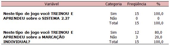 Ao final do programa de ensino-aprendizagem e treinamento os alunos responderam um questionário com 6 perguntas divididos em 3 quesitos: motivação, aprendizado tático e jogo coletivo.