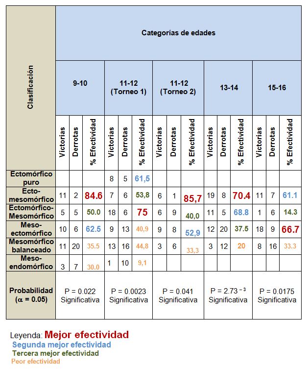 También se ha podido constatar en las 5 competiciones como regularidad, una efectividad negativa (obtienen más derrotas que victorias) en los sujetos clasificados como meso-balanceados y meso-endomórficos, lo que expresa la importancia del control y regulación del desarrollo morfológico en este deporte, no sólo como criterio para la selección de los posibles talentos, sino también para la planeación de las cargas físicas y su ulterior repercusión biológica, donde no siempre es posible la compensabilidad de las factores del rendimiento, más preocupantes cuando se trata de capacidades pocos o no entrenables.