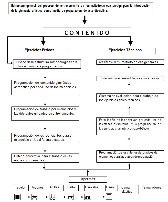 En este sentido la programación de los ejercicios para la formación gimnástica-acrobática, empleada en el período preparatorio de estos atletas, permite establecer, desde el punto de vista teórico-metodológico, los elementos cualitativos de la organización del entrenamiento de los saltadores con pértiga en la etapa de especialización inicial.