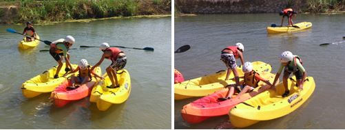 Zona profunda de corriente suave. Volcar “sin pala” y dar rápidamente la vuelta al kayak; remolcar hasta la orilla. El ejecutante decide como voltear el kayak. Vaciado individual o por parejas.
