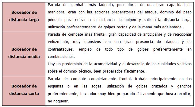 En cuanto a los boxeadores que empleaban en mayor o menor medida estas distancias, Degtiariov (1983) los clasificaba de la siguiente forma (tabla 1):