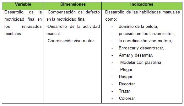 La inserción de actividades para potenciar el desarrollo de las habilidades en la motricidad fina en los niños con retraso mental dirigidas al empleo del juego, tributa a la compensación del defecto en los procesos cognoscitivo, percepción, pensamiento y la memoria.