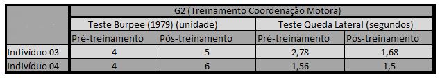 Através do quadro nota-se que G1 teve uma melhoria após o treinamento, tanto no teste de coordenação motora quanto no teste de queda lateral.
