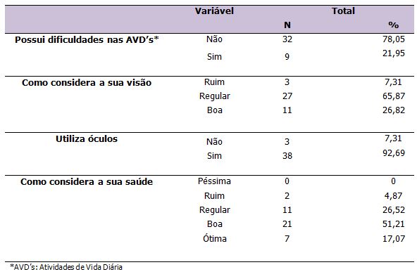 Na tabela 3 é apresentada a distribuição dos idosos quanto à saúde percebida. Em relação às atividades de vida diária, 32 (78,05%) idosos relataram não possuir dificuldades na realização. Na autoavaliação da visão, pouco mais da metade dos idosos entrevistados (65,87%) a autoavaliaram como regular, porém, 92,69% dos idosos faziam uso de óculos. A maioria dos idosos avaliou sua saúde como sendo boa.