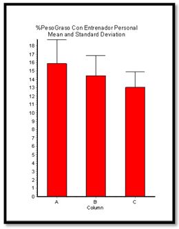 En la comparación del pre, inter y post test del porcentaje de masa grasa, también ambos grupos presentaron diferencias significativas al comparar independientemente un grupo del otro sus pre, inter y post test. Para el grupo con entrenador personal el grado de significancia se estableció con p<0.0001. En tanto para el grupo que trabajó sin este asesoramiento se estableció un p=0.0005. En ambos casos las mayores diferencias se establecieron entre el pre y post test (p<0.001 en ambos casos).