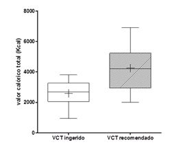 A Figura 2 apresenta o valor calórico total ingerido e o recomendado para os atletas na fase pre-contest.