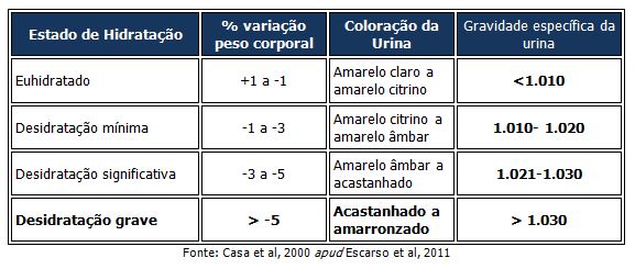 PERRELA, M. M.; NORIYUKI, P. S.; ROSSI, L. Avaliação da perda hídrica durante treino intenso de rugby. Rev. Bras. Med. Esporte. vol.11 n.4, Niterói, Jul/Ago de 2005.