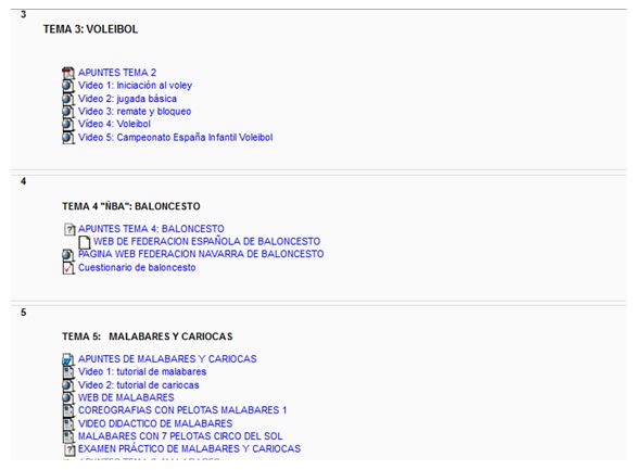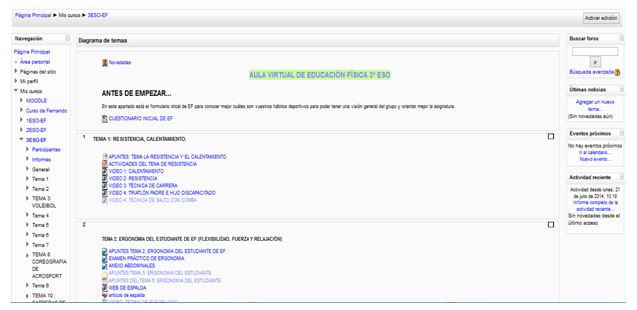 Figura 5. Parte central de un aula virtual de Educación Física en Moodle