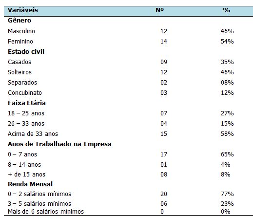 A pesquisa evidenciou que a idade dos participantes variou de 18 a 56 anos, sendo que a faixa etária com maior índice estava entre os participantes com mais de 33 anos (58%), 14 (54%) eram do gênero feminino, sendo que 12 (46%) dos entrevistados eram solteiros. Quanto ao nível de escolaridade foi evidenciado que 16 (62%) possuíam o ensino médio, que 17 (65%) dos questionados trabalhavam na empresa há menos de 7 anos, e 77% possuíam renda mensal de 0 até 02 salários mínimos.