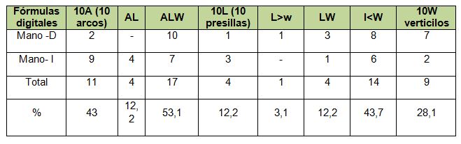 Tabla I. Disposición dermatoglifica y predominio de las diferentes formulas digitales en la muestra estudiada (32 Atletas)