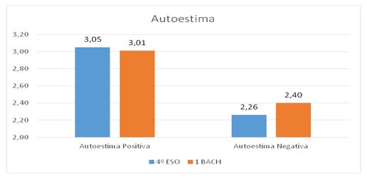 Así, los alumnos de 4º de la ESO y 1º de Bachillerato muestran una media de 3,05 y 3,01 respectivamente en Autoestima positiva. Y de 2,26 para 4º de la ESO y 2,40 en alumnos de 1º de Bachillerato en autoestima negativa.