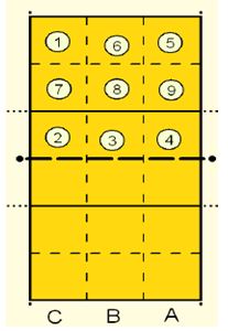 Os fundamentos do voleibol são os seguintes: saque, recepção ou passe, mergulho, levantamento, bloqueio, ataque. Para uma melhor análise a área defensivamente é dividida em nove partes, como pode ser demonstrado na Figura 1.