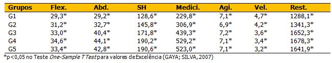 O gênero masculino apresentou diferença significativa em todos os grupos quando submetidos ao teste de arremesso de medicineball. Por outro lado, o gênero feminino não constatou diferença significativa no G4 e G5, o que significa valores compatíveis as normas de excelência estabelecidas pelo Ministério do Esporte. O motivo para tal situação pode ser justificado em virtude da puberdade iniciar-se mais cedo no gênero feminino.