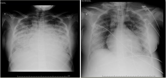 A puérpera foi submetida à intubação orotraqueal, iniciado suporte ventilatório invasivo, seguido de hemodiálise contínua devido aumento das escórias renais (diurese 650 ml/24h, potássio: 7,0 mEq/l,, creatinina: 4,79 mg/dl e uréia :169 mg/dl), além de toracocentese à direita 16/7 e à esquerda 14/7. Recebeu esquema de Meropenem e Vancomicina seguido de Ganciclovir (500 mg IV 12/12 h), Piperaciclina + Tazobactam (4G/500mg IV 8/8 h) e Claritomicina (500 mg VO 12/12 h).