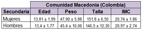 En los estudiantes de secundaria las mujeres presentan una edad de 13,81 ± 1,99, un peso de 47,90 ± 5,88 una talla de 151,8 ± 6,50 y un I.M.C. de 20,74 ± 1,86. En cuanto a los hombres arrojan una edad promedio de 13,4 ± 1,77, un peso de 45,4 ± 10,06, una talla de 146,5 ± 12,30 y un I.M.C. de 20,97 ± 2,74.