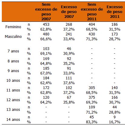Tabela 4. Excesso de peso nos escolares de 11 e 12 anos