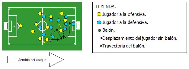 Situación 2: pase de frente y desplazamiento ante un adversario. El jugador “A” ante la oposición de un adversario (que se interpone en la línea de pase entre “A” y “B”), realiza un pase hacia el frente con el empeine exterior del pie derecho al jugador “B”, el cual se desplaza para recepcionar el balón. El jugador “A” se desplaza al espacio creado por “B”, como parte de la continuidad de la acción ofensiva. Este pase suele ser preciso y no tan fuerte, pero es engañoso y rápido, lo cual asegura la posición del balón y concluye la jugada con un pase al centro del área contraria. En general la intención con esta modalidad es engañar al contrario y evadir la oposición del defensa adversario.