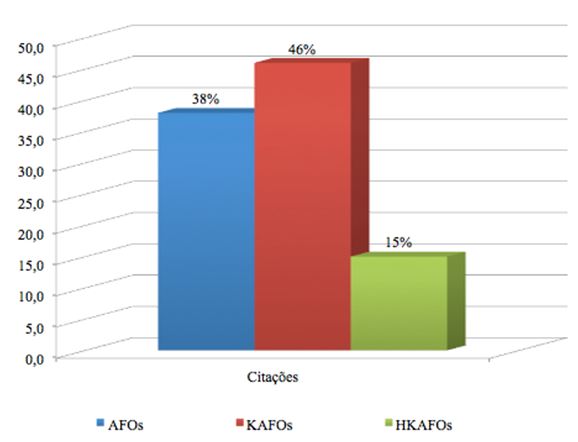 No Brasil, as Secretarias de Saúde tem utilizado terminologias próprias, fazendo uma correlação com segmento anatômico envolvido. Seguindo este critério, encontraremos descrições de órteses inguinopodálicas (HKAFOs), cruropodálica (KAFOs) e suropodálica (AFOs). De acordo com análise comparativa simples ficaram determinados os resultados conforme demonstra o Gráfico 1.