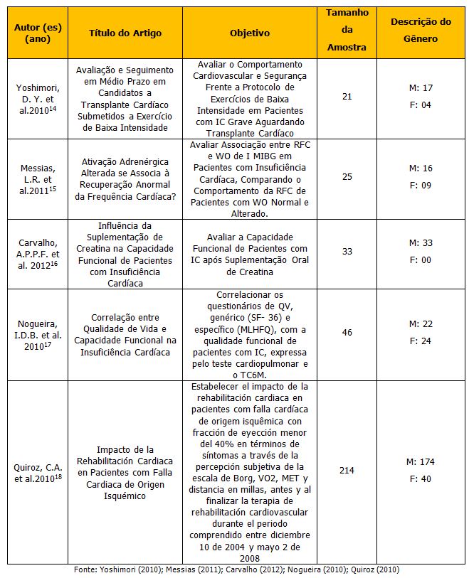 Conforme a estratégia definida, a pesquisa resultou em quatorze artigos, e, diante o objetivo de estudo e os critérios de inclusão e exclusão, foram selecionados apenas cinco artigos. Os nove artigos restantes abordavam outros tipos específicos de insuficiência cardíaca, o que não se adequavam ao perfil necessário para esta pesquisa. A quantidade de participantes dos estudos selecionados variaram entre 21 pacientes a 214 pacientes. Quanto ao gênero, o número de prevalência do sexo masculino é bem mais significativo em relação ao sexo feminino, no total foram 262 homens e 77 mulheres, no entanto em um dos estudos os pesquisadores optaram pela a presença do sexo masculino, por conta que poderia existir perda no seguimento da amostra e prejudicar a conclusão do estudo no prazo previsto.