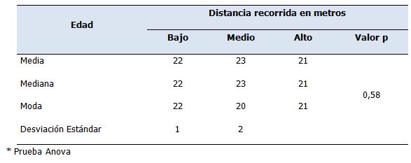 Se realizó un análisis con las variables cantidad máxima de oxígeno, tiempo total del test y distancia recorrida en metros según edad y peso en donde se logró identificar los mismos resultados para los tres niveles de rendimiento.