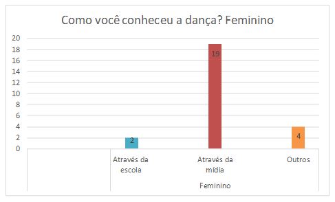 De 30 mulheres entrevistadas, 19 conheceram a dança atraves da midia, 4 de outras formas e somente 2 através da escola.