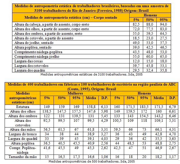 As tabelas a seguir apresentam medidas de indivíduos brasileiros, a primeira uma amostra de 3100 trabalhadores homens e a segunda 500 indivíduos, contento mulheres e homens (PANERO, 2006)