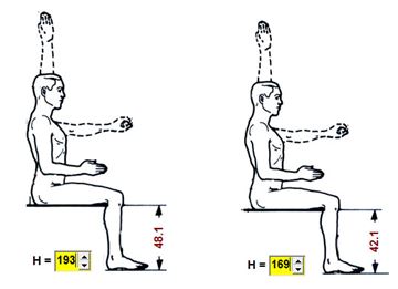 Da mesma maneira, para que seja mantida angulação de 90° dos joelhos, a altura máxima de um indivíduo utilizando vestimentas que lhe somem 80mm em, e com a altura do assento na altura máxima (500mm) seria inferior a 1,93m, se considerar-se que estes 80mm adicionais estejam concentrados nos pés, como altura dos sapatos, a altura máxima do indivíduo deveria ser inferior a 1,69m.