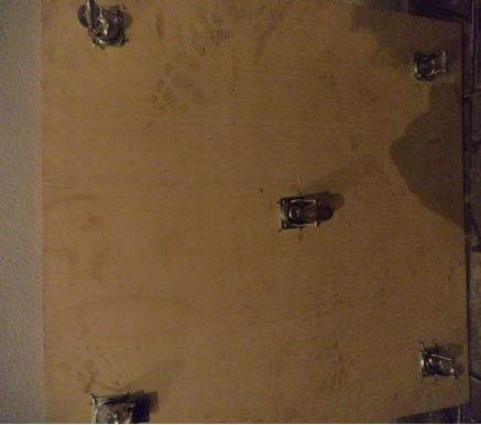 Pedaços de madeira parafusados com rodinhas flexíveis, presas com fita adesiva cinza, para fazê-la deslizar (4 rodas pequenas e 1 roda media).