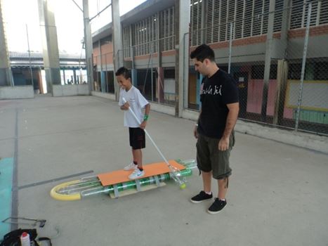 Remo: um cabo de varão de ferro e uma bola de tênis colocado na parte de baixo, para dar impulso à prancha.