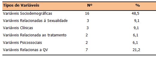 No que diz respeito às variáveis utilizadas nos artigos em estudo encontrou-se as de ordem sociodemográficas (idade em anos, estado civil, escolaridade, ocupação, renda familiar); em 16 artigos, variáveis relacionadas á sexualidade (orientação sexual, uso de preservativo feminino ou masculino). Em 3 artigos, variáveis clínicas relacionadas a infecção pelo HIV (tempo do diagnóstico, número de células CD4); em 3 artigos, relacionadas ao tratamento (uso de antirretrovirais); em 2 artigos, variáveis psicossociais (presença de sintomas de depressão e auto-estima, relacionamento afetivo sexual) e finalmente em 7 artigos (21,2%) as variáveis relacionadas ao estudo da qualidade de vida (avaliação da QV utilizando instrumentos).