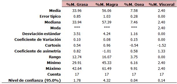 En la tabla 2, se pueden observar los estadísticos descriptivos de los porcentajes de la masa magra que es de 56.06 ± 4.24 con un coeficiente de variación del 8%, de la masa grasa que es de 33.96 ± 3.51 con un rango de 12.97, la media del porcentaje de masa ósea es de 7.58 ± 1.16 con una variación del 15% y la media de la masa visceral, la cual es de 2.4 ± 0.00 con estos valores promedio podemos declarar que los universitarios tienen el porcentaje de la Masa Grasa de acuerdo a la SEEDO (Sociedad Española para el Estudio de la Obesidad), fuera de los valores normales, ya que es de 16-20 % para la edad de 21 a 25 años. Sí comparamos nuestros datos con los cálculos de Bray (2003) citado en Corvos (2013), quien dice que el valor normal es de 12-20 % para varones, la muestra se encuentra del mismo modo fuera de los valores normales para dicho componente. La media del porcentaje de la Masa Magra, es la que mayor valor presenta siendo de 56.06 ± 4.24 y con un coeficiente de variación de solo el 8%.