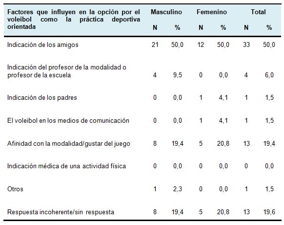 En la tabla 1 está presentada la clasificación, por género, de los motivos que influyen los adolescentes a escoger el voleibol como práctica deportiva orientada. Se observó que lo principal factor que motivó los adolescentes a entrar en una escuela de voleibol fue la “indicación de los amigos”. En total, 50,0% de los participantes adolescentes comenzaron a entrenar porque los amigos los convencieron. En una comparación entre los géneros, se notó una semejanza: 50,0% de los chicos y 50,0% de las chicas apuntaron esto factor. Ningún adolescente del género masculino apuntó los factores “indicación de los padres”, “el voleibol en los medios de comunicación” e “indicación médica de una actividad física” como los motivadores para la iniciación en la modalidad. Esto último y la “indicación del profesor de la modalidad o profesor de la escuela” fueron los dos factores no apuntados por los adolescentes del género femenino.