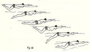 9. Pateo delfín sin interrupción, con ¼ de rotación en el eje longitudinal cada 2-4 patadas; los brazos se mantienen junto al cuerpo.