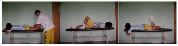 PI: Paciente decúbito supino, manos al lado del cuerpo: elevar la pierna de la rodilla lesionada extendida y desplazarla a la derecha, mantener 5 segundos luego a la izquierda mantener 5 segundos y bajar.