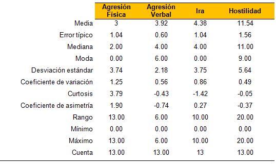 En la tabla 13 se muestran los estadísticos descriptivos de los jugadores de Odontología registran niveles medios de hostilidad con un promedio de 13.56 ± 2.79 puntos, y mantiene niveles bajos en la Agresión Física, ya que el promedio es de 3.33 ± 3.48 puntos, en relación a la Agresión Verbal, el promedio es de 4.00 ± 3.18 puntos, y su coeficiente de variación del 80% respecto a la ira, su promedio es de 3.72 ± 3 puntos