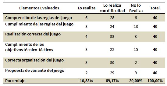 La tabla 1 ejemplifica el nivel inicial al cual se enfrentaron los alumnos en la comprensión del deporte karate sin haber socializado algunos elementos básicos del deporte mediante juegos predeportivos en sus respectivas escuelas formativas, a partir de las clases de educación física. Los datos determinaron que de 40 karatecas estudiados en el año 2015 solo el 10,83% de ellos realizaban los ejercicios diseñados como parte de la preparación del deportista de forma adecuada al nivel docente-educativo normal para deportistas de iniciación en los tres primeros microciclos de entrenamiento, mientras que el 69,17% de los alumnos realizaban los ejercicios con un alto grado de dificultad en los tres primeros microciclos de entrenamiento de los seis elementos evaluados. Por otra parte, existieron varios deportistas de iniciación (20,00%) que no pudieron realizar los distintos ejercicios básicos para la enseñanza teórica y técnico-táctica en los tres primeros microciclos de entrenamiento.