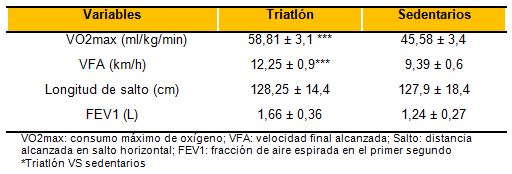 Tabla 2. Comparativa entre triatletas y sedentarios benjamines