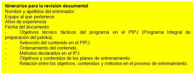 Por orden se analizó primero los Planes y Programas, para áreas masivas, de Chinea y Mesa (1979), documento elaborado para áreas masivas, donde agrupa una serie de elementos técnicos necesarios para estas áreas pero no alude a la instrucción táctica.En un segundo momento se analizó el Sub sistema de Alto Rendimiento, documento con una mayor profundidad en los componentes de la preparación pero sin una orientación específica de tratamiento para la preparación táctica según la etapa de la preparación.