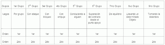 Ejemplo: Existe un juego conocido por todos "de hacer salir a alguno de un círculo" este juego se puede realizar de dos formas, el ganador se puede considerar el que primero saque al contrario del circulo, aquí el juego puede ser de primer orden, pero si en este juego a uno de los participantes de le da la tarea de estar en él circulo un determinado tiempo y al otro de sacar al contrario del circulo, entonces en este caso es un juego de segundo orden. Las características están dadas por las condiciones en que se realiza los ejercicios con objetivos, de acuerdo con este principio los juegos de 1er y 2do orden se pueden dividir en 5 grupos. (tabla # 2)