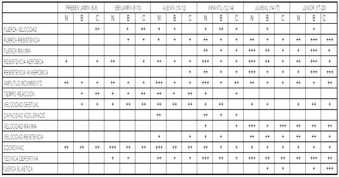 Fig. 3. Entrenamiento de las cualidades físicas y habilidades en los distintos segmentos en niños. ![]()