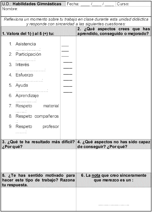 Pues bien, teniendo presente esta nueva forma de entender la evaluación, presentamos una experiencia práctica de evaluación de las habilidades gimnásticas para el segundo ciclo de la Enseñanza Secundaria, centrada en los procesos, en la que no importa tanto los resultados y sí el camino que el alumno va a recorrer hasta llegar a los mismos, de tal forma que se puedan detectar los puntos débiles y regular inmediatamente dicho proceso para alcanzar mejor los objetivos previstos.