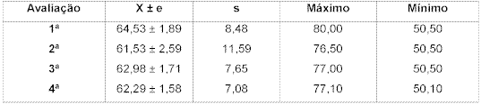 A tabela 2, apresenta os dados da variável % de gordura. Onde se observou uma diminuição da primeira para a quarta avaliação.
