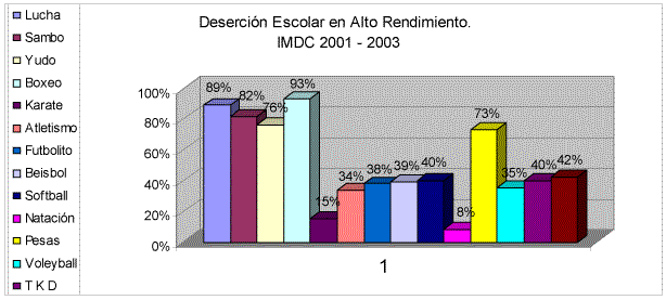 La Deserción Escolar fue más frecuente en Boxeo 93%, seguida por Lucha 89%; Sambo 82%; Judo 76%; Pesas 73%; Básquet 42%; TKD 41%; Softball 40%; Béisbol 39%; Futbolito 38%; Volley Ball 35%, Atletismo 34%; Kárate 15% y Natación 8%.