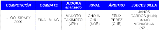El Judoka investigado será el japonés Makoto Takimoto, en el combate disputado por la medalla de oro en los últimos Juegos Olímpicos de Sidney 2000, y que lo proclamó campeón frente al coreano Cho In-Chul.