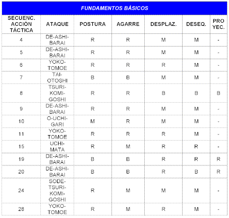 Terry (2000) toma, como una de las medidas metodológicas en su observación para la táctica en Judo, los fundamentos básicos, compuestos por: posturas, desplazamientos, agarres, desequilibrios, ataques y caídas. Estos elementos técnico-tácticos son las partes esenciales e imprescindibles de la acción técnico-táctica, que interrelacionados en un sistema biomecánico de entrenamiento son la base de la estructura motora de la técnica y de la táctica en el Judo. Siguiendo a Espartero y Gutiérrez (2002), explicamos a continuación las características de estos elementos: