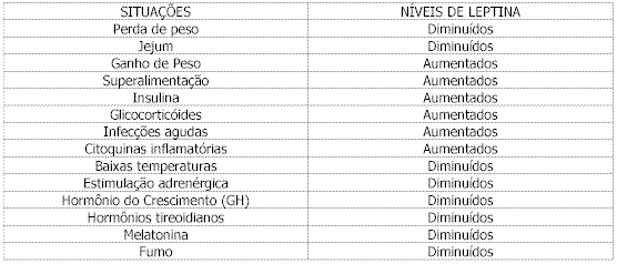 Ocorre uma diminuição de leptina em resposta a baixos níveis de insulina, havendo uma relação diretamente proporcional entre as concentrações desses hormônios, FRACETO et al. (2002). A tabela 01 indica os principais fatores e a correlação com os níveis de leptina.