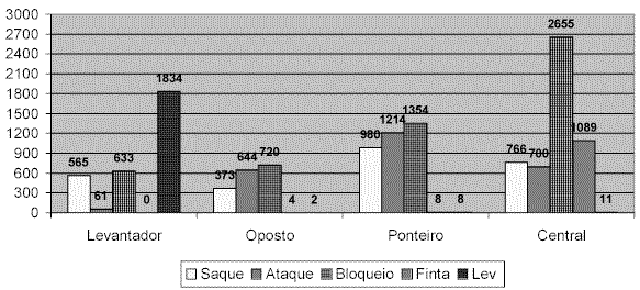Apresentando o bloqueio com um maior percentual de SV 39,37% do total de ações do jogo, sendo este resultado bastante distinto dos encontrados por Cordeiro (2001) que diz que o bloqueio representa 20% das ações e de Esper (2003) que encontrou 50% das ações. As diferenças aqui demonstradas podem ter sofrido uma forte influencia da solicitação técnica e competitiva a que os grupos foram submetidos (Figura 1).
