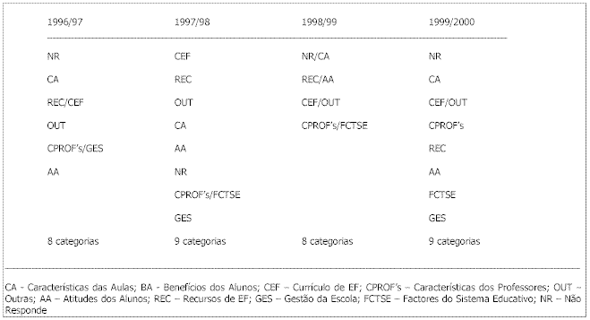 Foram definidas categorias para a análise das respostas à questão 2 (EF - palavra-síntese), elaboradas e validadas, que resultaram da análise interpretativa dos dados. A questão 3 (2 experiências positivas e 2 negativas em EF) foi analisada a partir da utilização de um sistema de categorias elaborado e já validado por Carreiro da Costa et al. (1996).