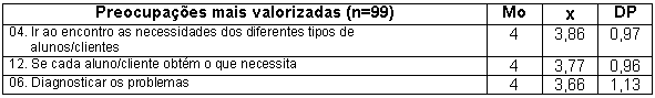 Preocupações mais e menos valorizadasAs tabela 3 e 4 apresentam respectivamente, os resultados de moda (Mo), média (Me) e desvio padrão (DP) das três preocupações mais e menos valorizadas, considerando todo o grupo.